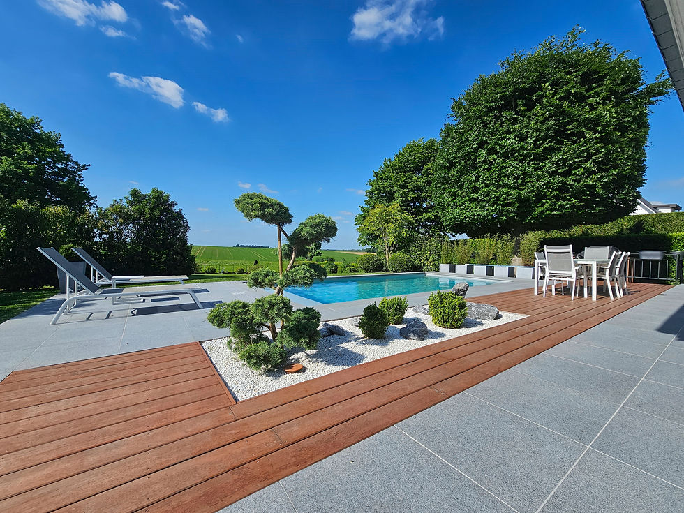 La terrasse en pierres bleues (56m²) est orientée sud-ouest et est à l’abri des regards. L’entrée de la propriété offre un magnifique accueil et de nombreux emplacements de parking.